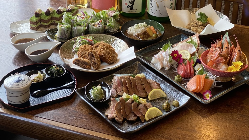 ・前菜3種(和え物、酢の物、一品料理)・牛たんローストビーフの生春巻・刺身5種盛・牛たん炭火焼(極上厚切り牛たん・厚切り牛たん)・牛たん唐揚げ・牛たんメンチかつ・ミニ牛タンシチュー・抹茶ケーキ